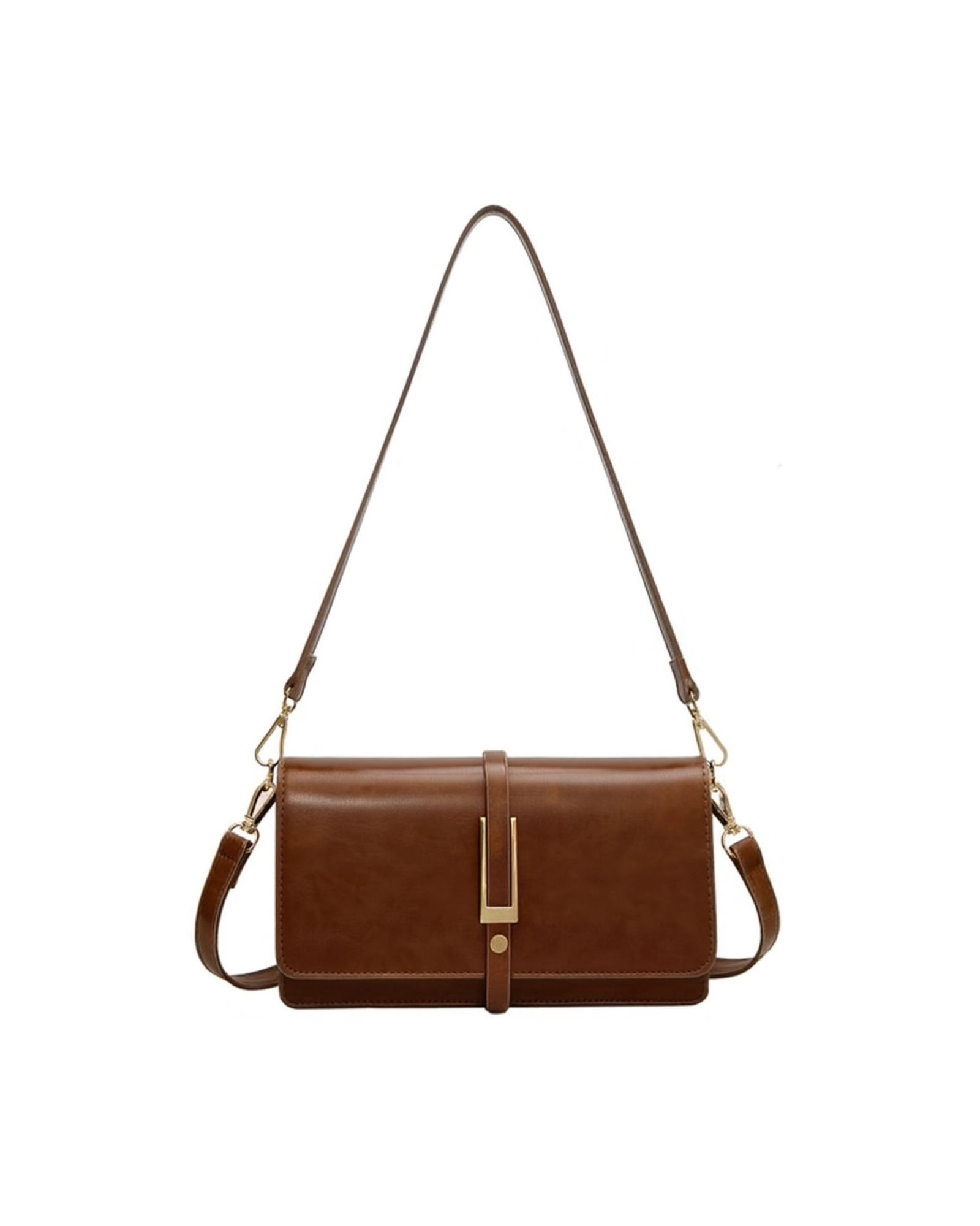It's a premium smooth leather shoulder bag paired with refined gold-tone hardware for a luxurious finish. The front flap is secured with a modern decorative buckle accent. Adjustable shoulder strap for customizable comfort and dual compartments to keep your essentials neatly organized.