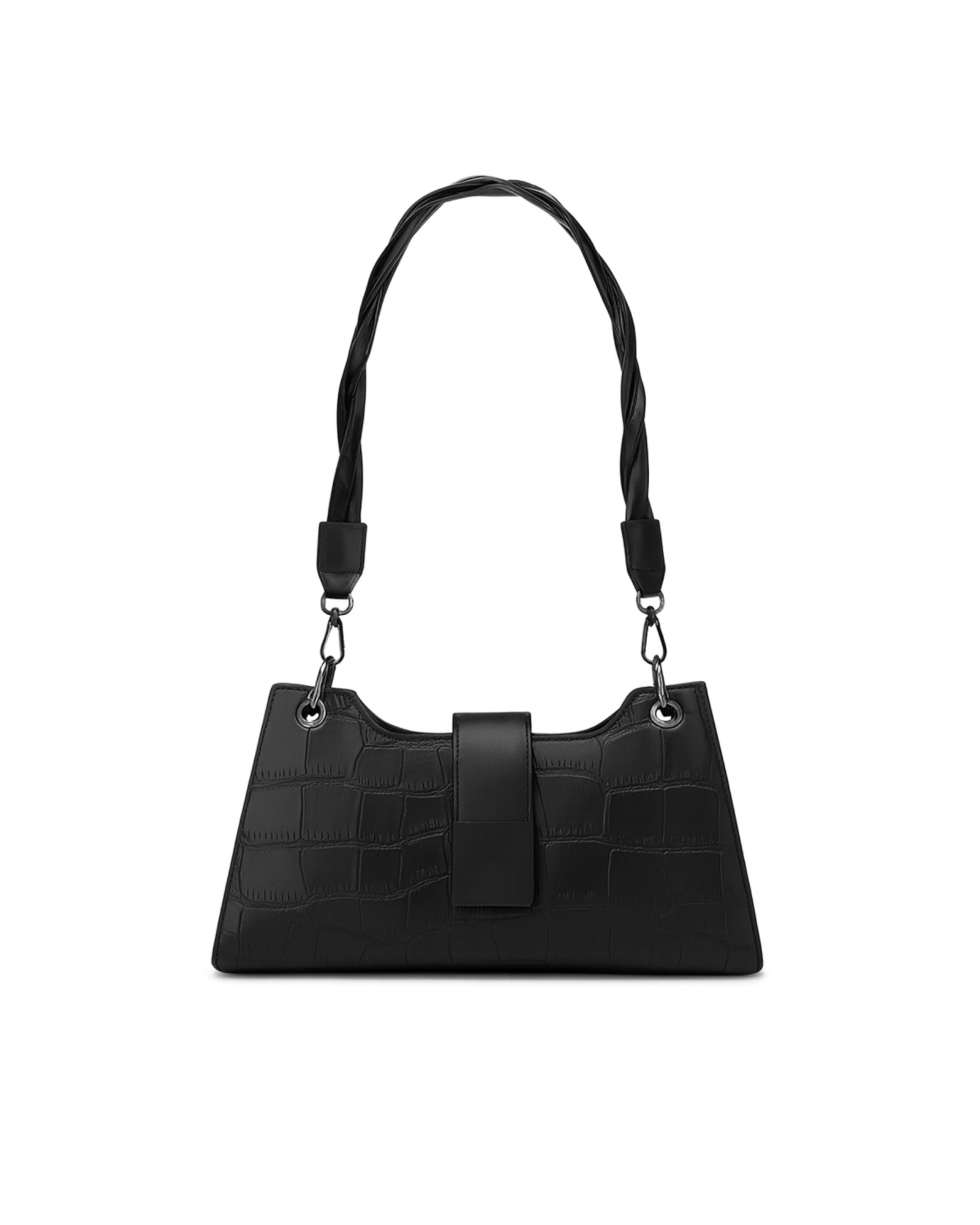 Sleek black shoulder bag, crafted with croc - embossed finish for a modern look. It features a secure front flap closure and a braided handle that adds a touch of elegance. Perfect for both formal and casual use.