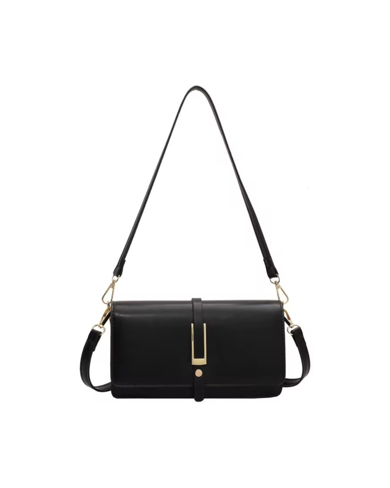 It's a premium smooth leather shoulder bag paired with refined gold-tone hardware for a luxurious finish. The front flap is secured with a modern decorative buckle accent. Adjustable shoulder strap for customizable comfort and dual compartments to keep your essentials neatly organized.
